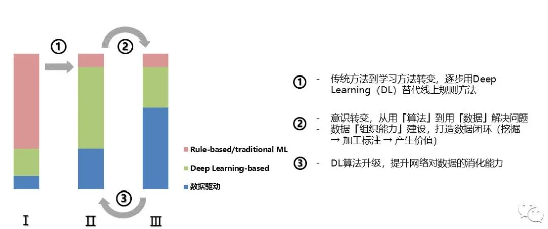 阶段Ⅰ – 此时数据基础设施建设相对薄弱,系统内Deep Learning化模块/功能占比较低,研发主力是已在某领域经过长期系统化训练的算法专家,他们用计算机语言将掌握的专业知识转化为功能性确定的代码,我们内部称这类初期算法「Rule-based」和「Traditional Machine Learning」方法。