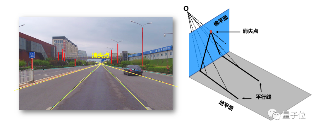 Apollo Lite在线标定算法并不依赖高精地图,通过学习道路上线状特征如车道线和马路边沿,拟合出多条空间中的平行线在图像投影上的交点 — 消失点(Vanishing point),基于透视几何原理,可精确估计车辆行驶中相机俯仰角的实时变化的情况。