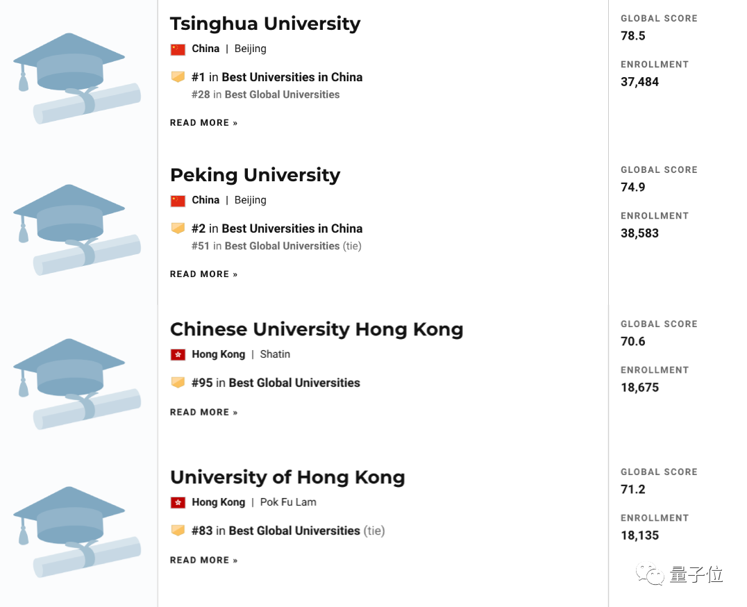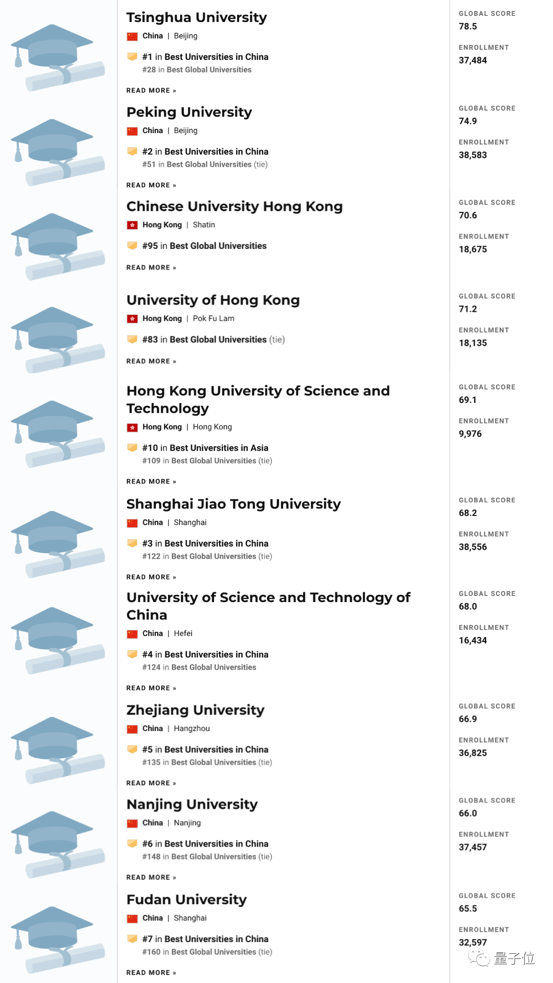 而从中国大学整体情况来看,根据US News榜单,前10名如下: