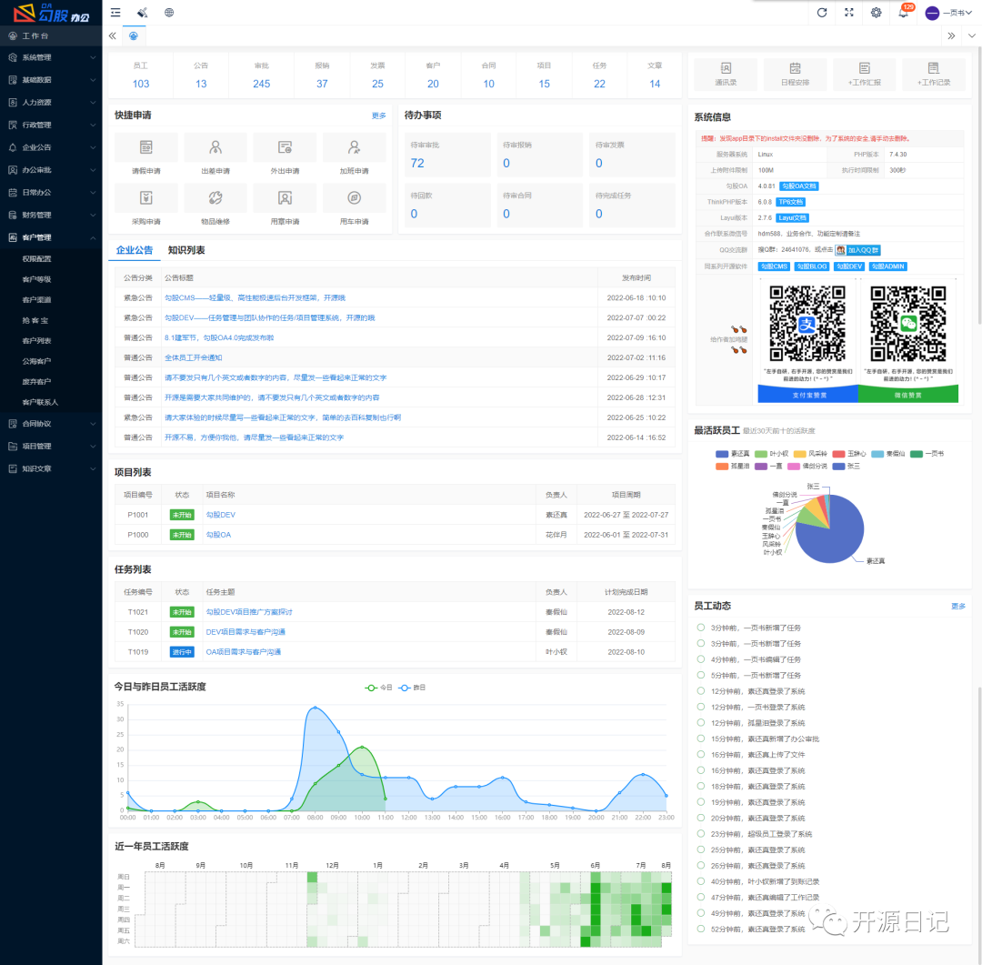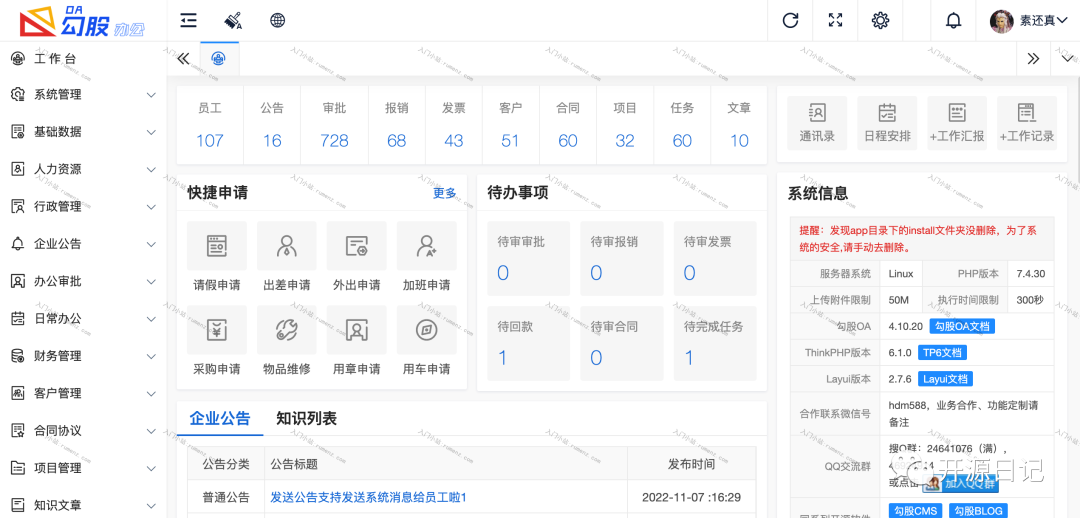 勾股OA是一款基于ThinkPHP6 + Layui + MySql打造的实用的开源的企业办公系统,开箱即用,使用勾股OA可以简单快速地建立企业级的办公自动化系统。