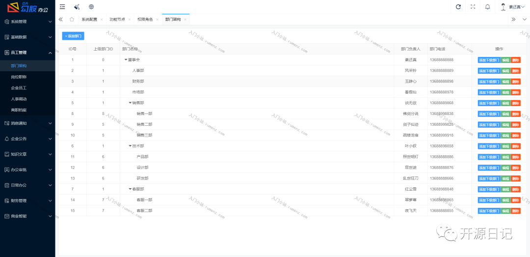系统后台集成了主流的通用功能,如:登录验证、系统配置、操作日志管理、角色权限、职位职称、功能菜单、模块管理、关键字管理、文件上传、数据备份/还原、基础数据、审批流程、员工管理、消息通知、企业公告、知识文章、办公审批、日常办公、财务管理、API接口等。更多的个性化功能可以基于当前系统便捷做二次开发。