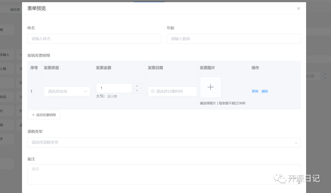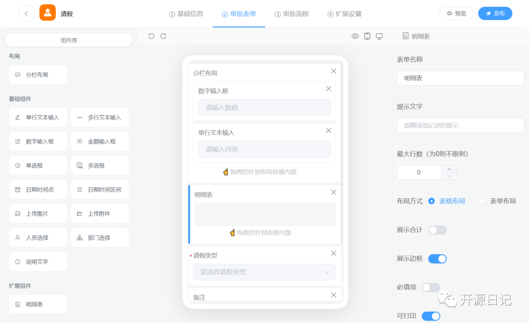 支持分栏布局、明细表格、以及多种基础组件,支持自定义开发组件