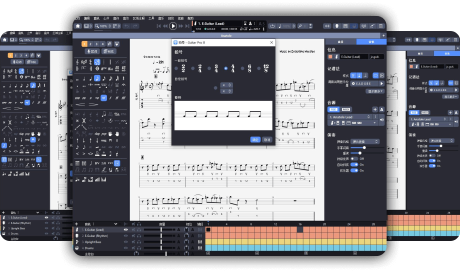 只需直接在五线谱或六线谱上编辑,即可轻松谱写自己的乐章。所有与吉他及其他弦乐器有关的常用音乐符号都可为你所用。