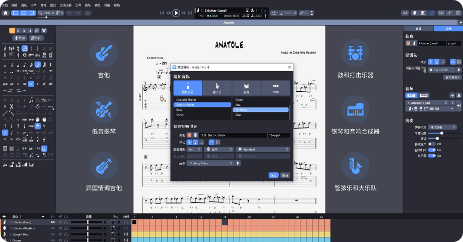 在多轨乐谱下,您可以使用吉他,贝司,尤克里里,鼓,钢琴,人声,弦乐,铜管等数十种乐器创建乐谱。