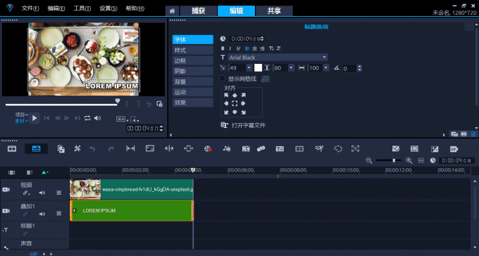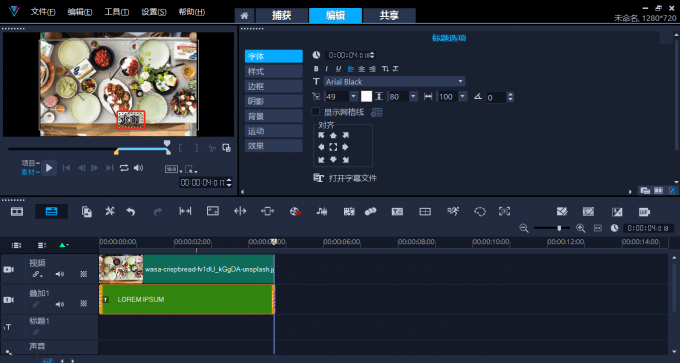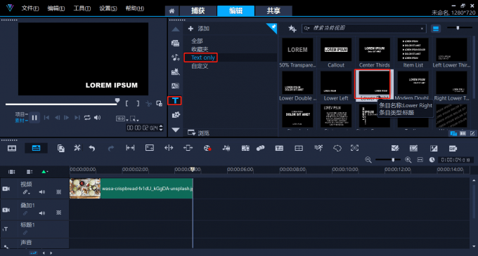 2、点击界面右上角工具栏中的标题工具,再点击Text only,然后选择一个文本模板,把它拖到覆叠轨上。如果是添加图片水印,直接在覆叠轨中插入水印素材即可。