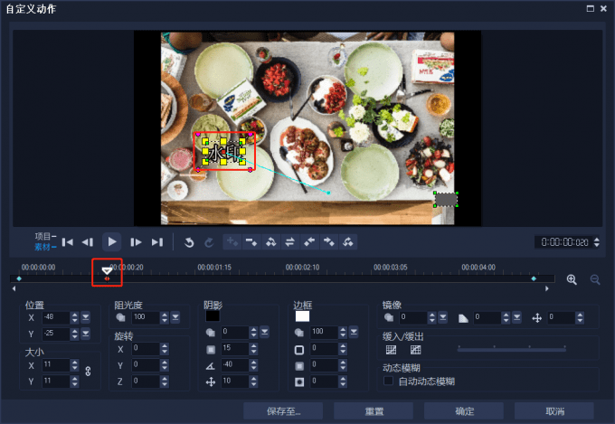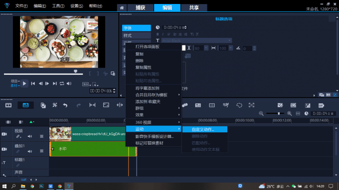 6、为了让水印效果更好,可以右键单击文本,选择运动,再点击自定义动作,会弹出自定义动作的对话框。