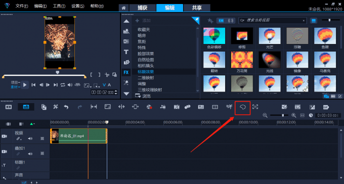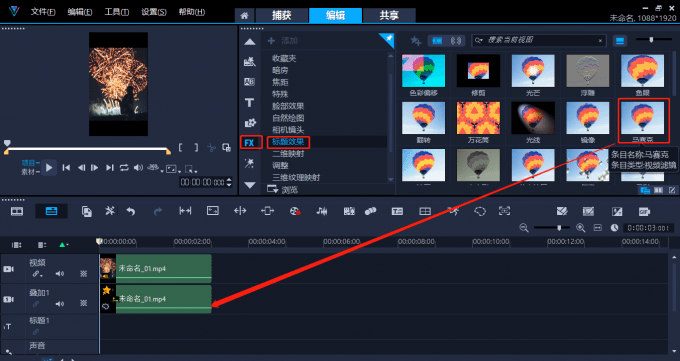 3、点击工具栏中的FX,即滤镜工具。然后选择标题效果,在列表中找到马赛克并拖到遮罩轨道上。