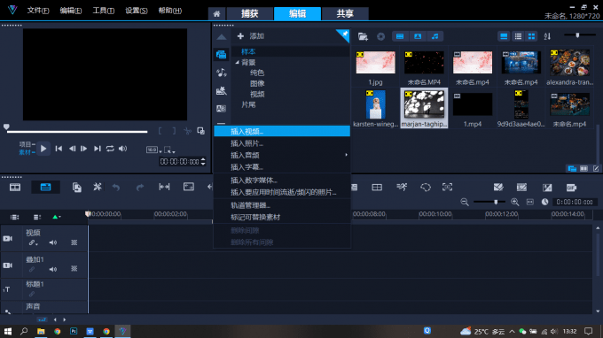 1、打开会声会影 2023旗舰版,创建一个新项目。在软件主界面下方的是视频轨,在视频轨空白处右键单击,插入需要添加水印的素材。