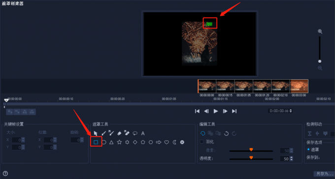 2、在遮罩创建器弹窗中,选择矩形遮罩工具,然后用矩形框选视频中有水印的部分,选择时选区会呈绿色。选好后点击保存,软件会在时间轴上自动创建一个遮罩轨道。