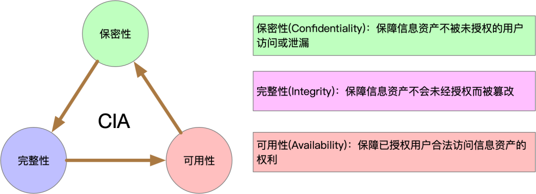 我们安全建设的目标是:保障信息资产的保密性(Confidentiality)、完整性(Integrity)、可用性(Availability):