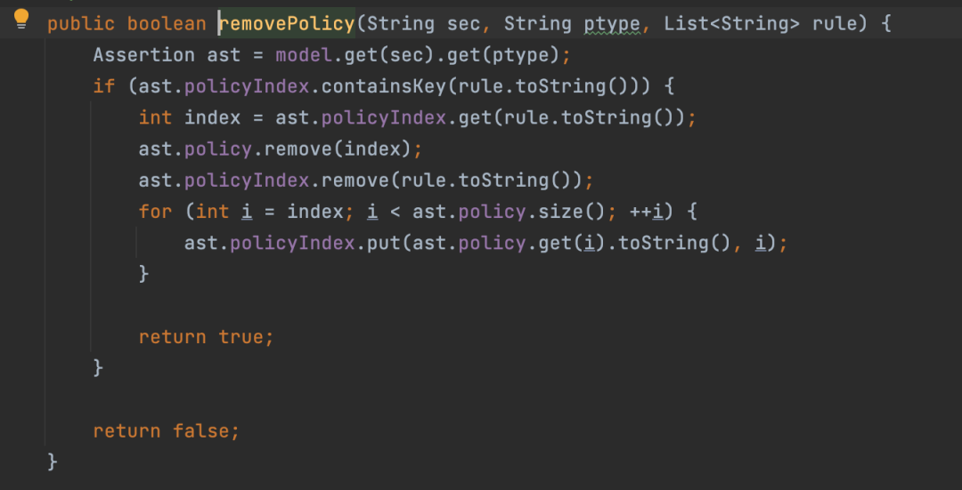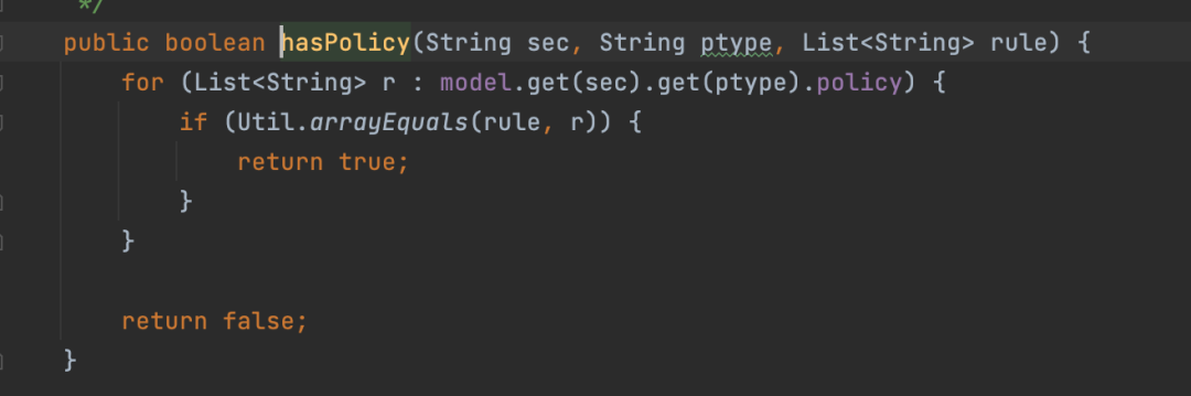 我们做权限迁移时,需要在Casbin中加载所有的权限策略,我们发现,Casbin加载性能很低,通过Debug后将问题定位在hasPolicy的实现上。
