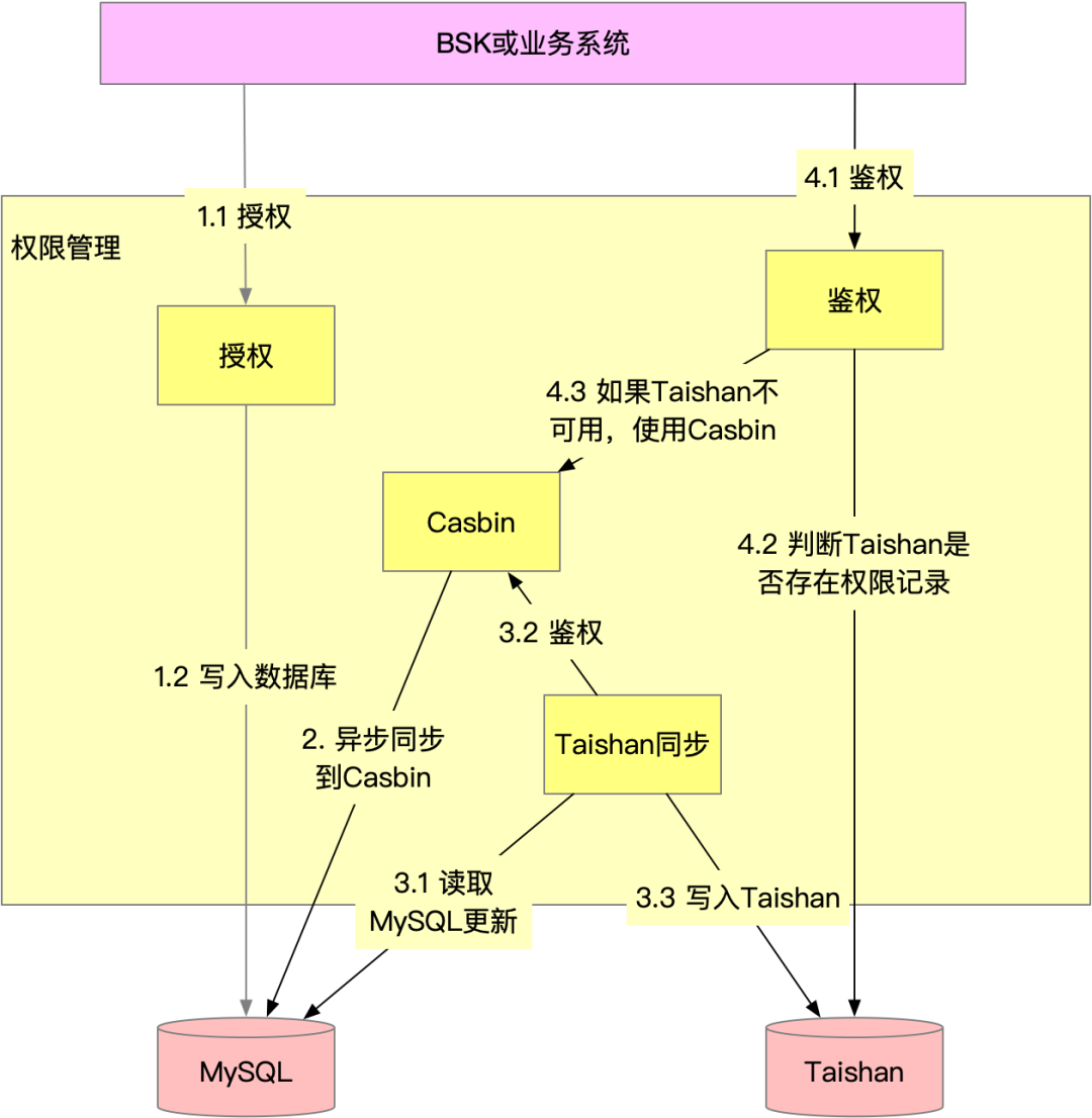 权限系统使用Taishan缓存权限策略,以减少服务和数据库的压力,权限系统内部处理流程如下: