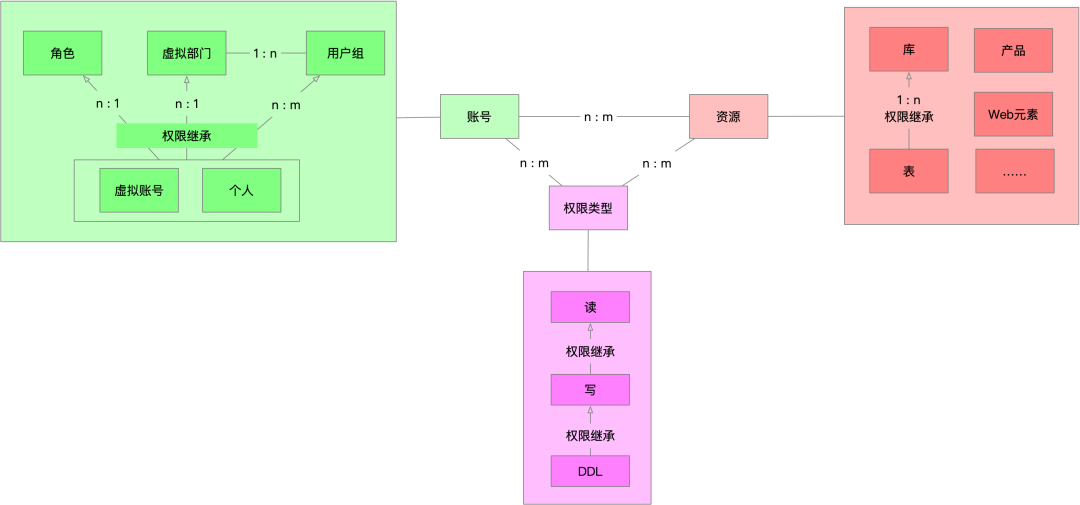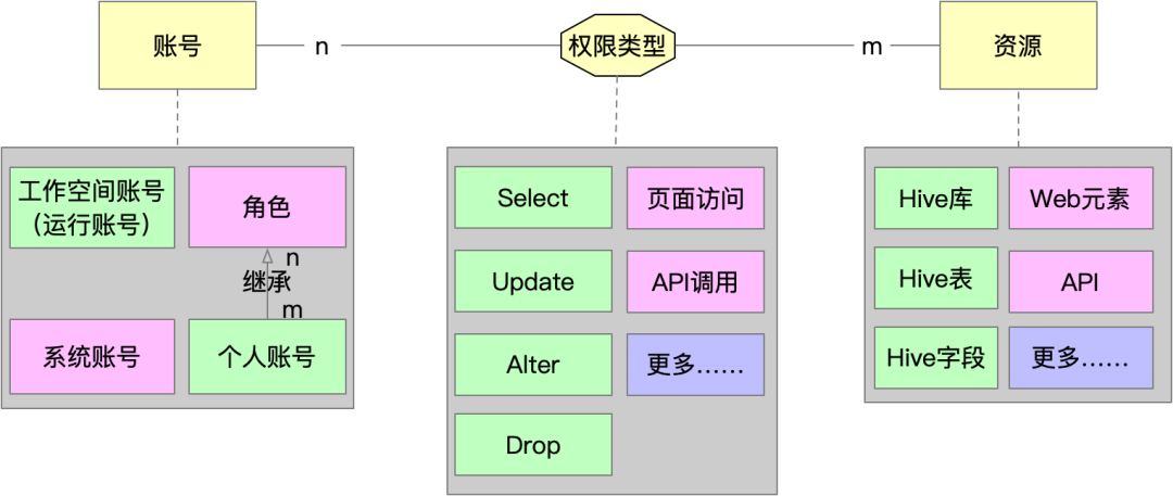 本质上,权限主要包含三个部分:账号、资源和权限类型。相比于1.0,权限2.0对这三块在设计上较大改变,主要体现在: