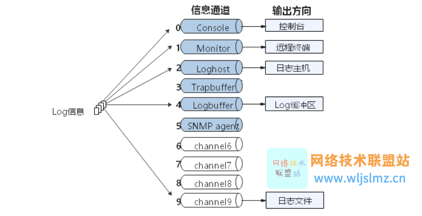 如图1所示,日志有5个输出方向,分别为控制台、远程终端、日志主机、Log缓冲区和日志文件。缺省情况下,5个输出方向与5条信息通道一一对应。用户可以根据需要更改信息通道的名称,也可以更改信息通道与输出方向之间的对应关系。