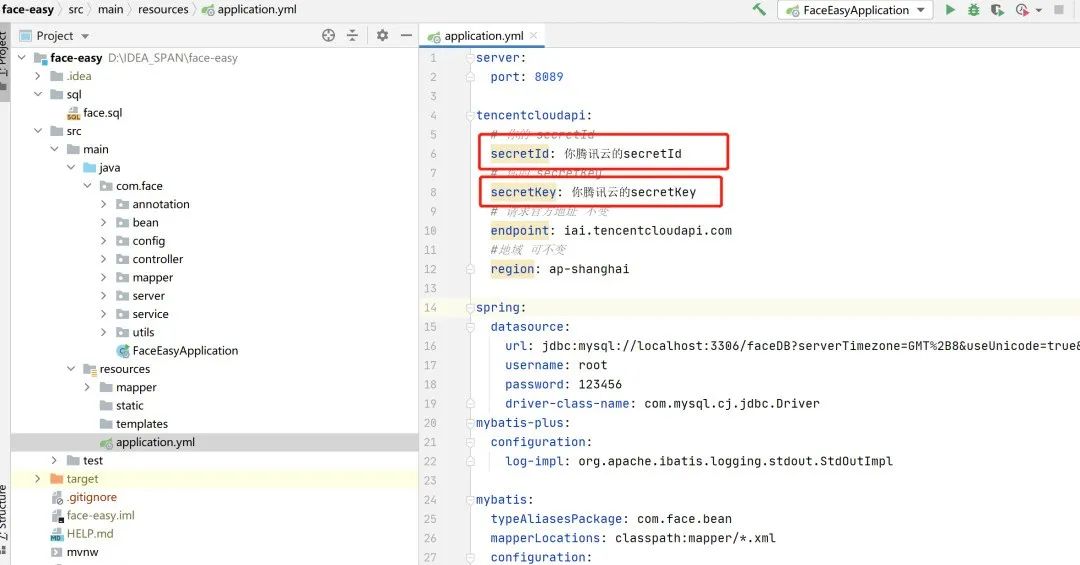 4,获取secretId和secretKey,并开通人脸服务之后,将secretId和secretKey配置到yml文件中