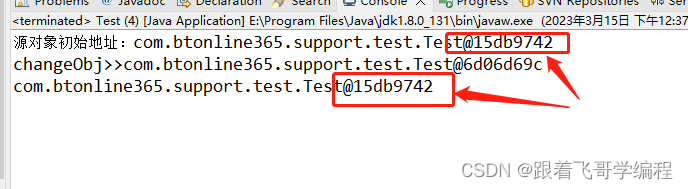 稍微解释下这张图,当我们在main中创建一个Test对象的时候,在堆中开辟一块内存。然后a1持有该内存的地址 @15db9742 (图1)。当尝试调用changeObj方法,并且a1作为实际参数传递给形式参数a的时候,会把这个地址@15db9742 交给a,这时,a也指向了这个地址(图2)。然后在changeObj方法内对参数进行修改的时候,即a=new Test();,会重新开辟一块 @6d06d69c的内存,赋值给a。后面对a的任何修改都不会改变内存@15db974的内容(图3)。
