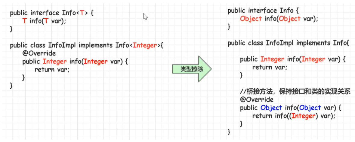 桥接方法 因为在编译的时候,为了保证实现类重写了接口的方法,虽然实现类有了Integer的方法,但是在泛型擦除的时候会在实现类中生成一个Object的方法。