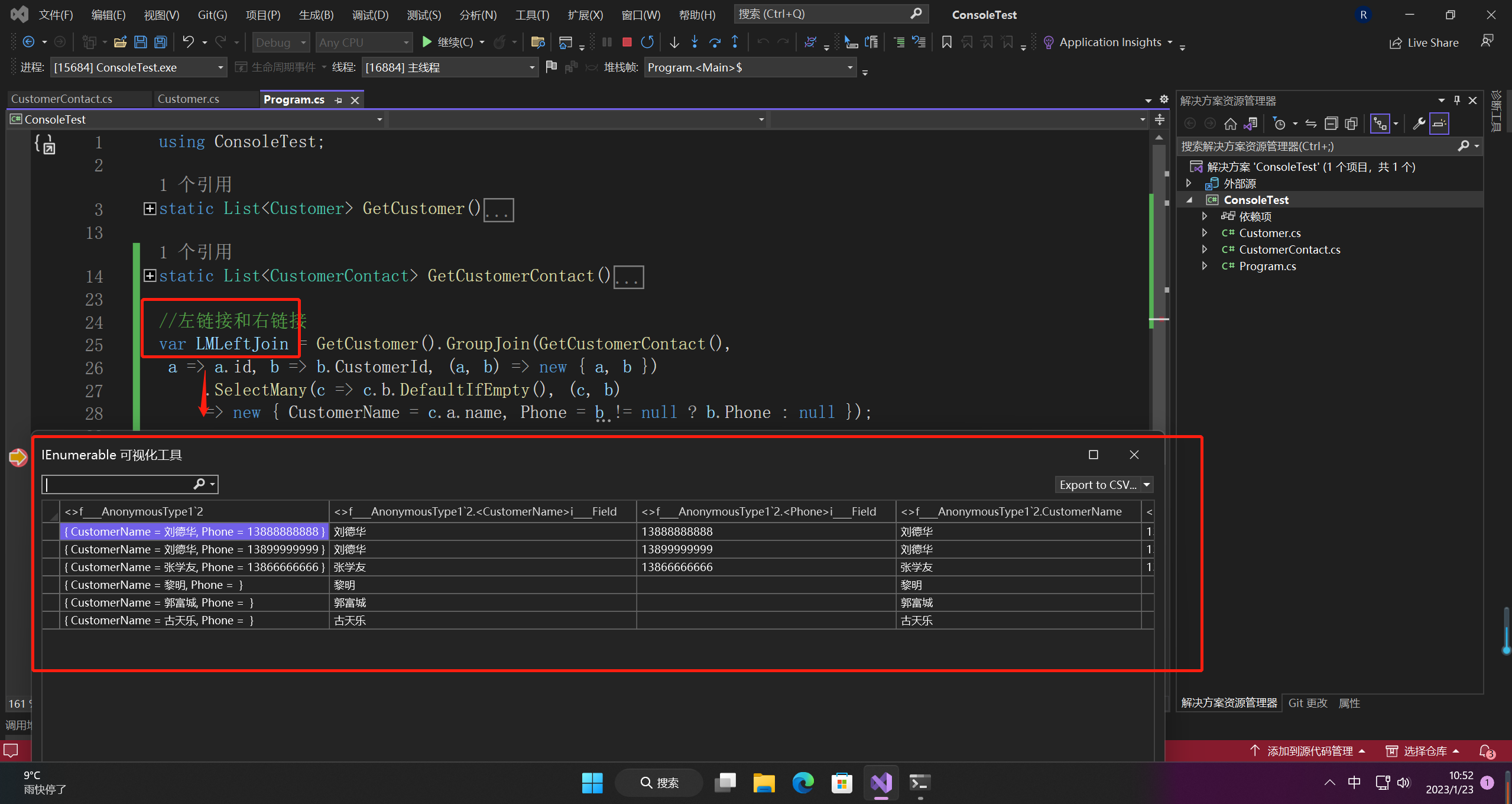 , (a, b) => new { CustomerName = a.name, Phone = b.Phone });