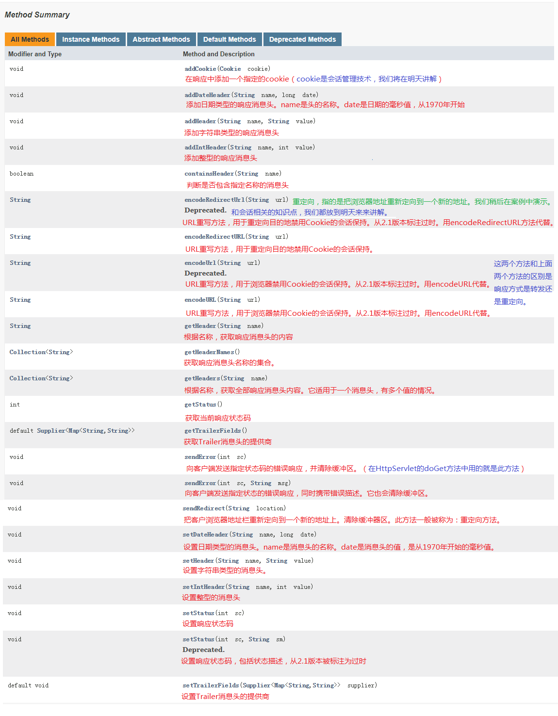 在HttpServletResponse接口中提供了很多方法,接下来我们通过API文档,来了解一下这些方法。