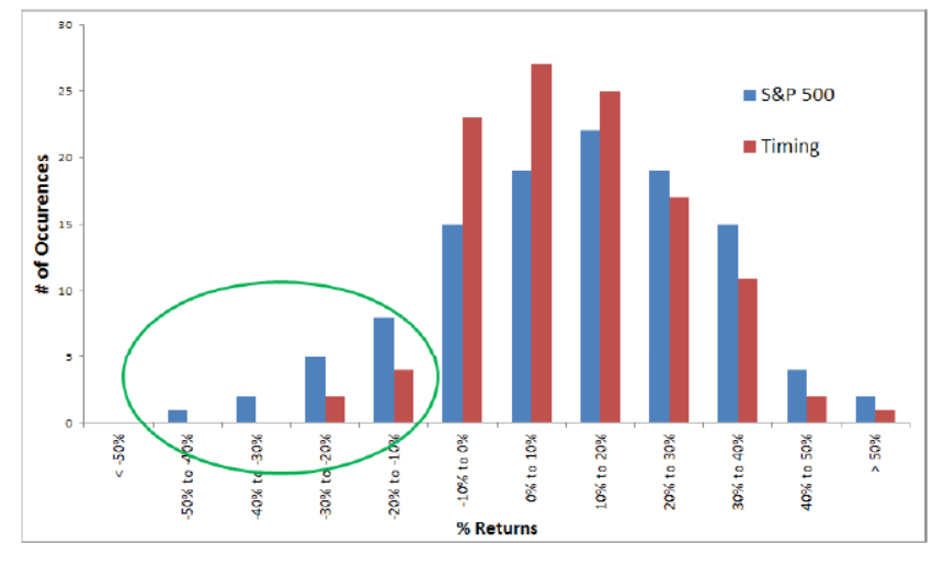 统计收益的分布情况,可以明显看出,择时策略的负向收益更少,呈现右偏特征。