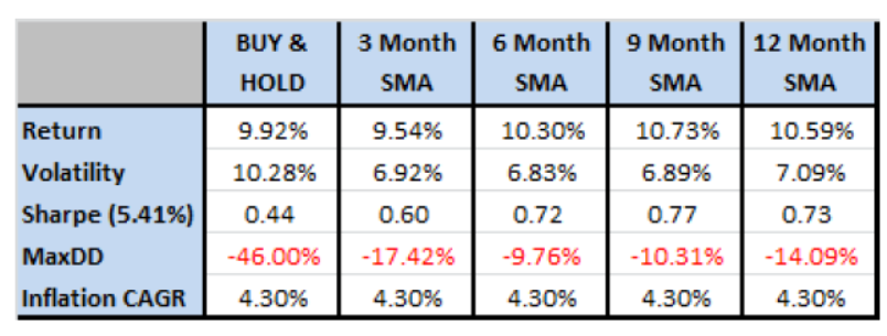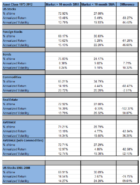 统计发现,在10个月SMA上下,各类资产的风险收益比都呈现出相似的特征,以上收益更高,以下波动率更高。