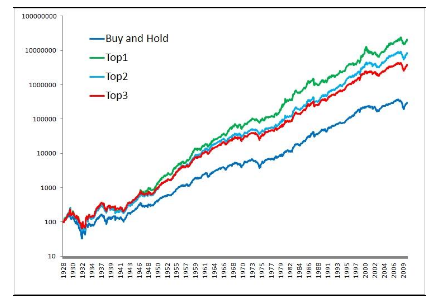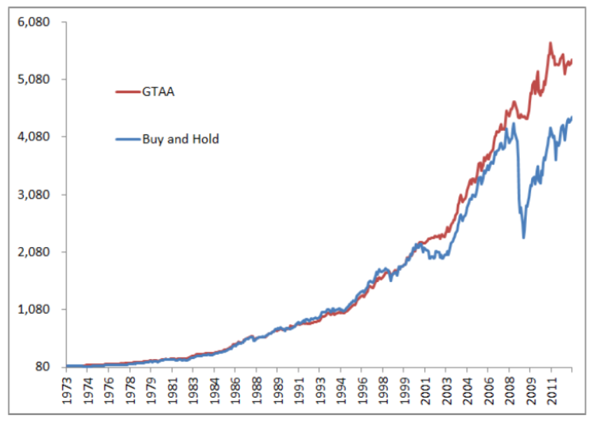 以上是在单品种上测试的结果,将这一策略用于多资产类别做资产配置,发现也是有效的,如下图,GTAA为分别对每个单资产使用这一策略,Buy and Hold为等权持有的表现。