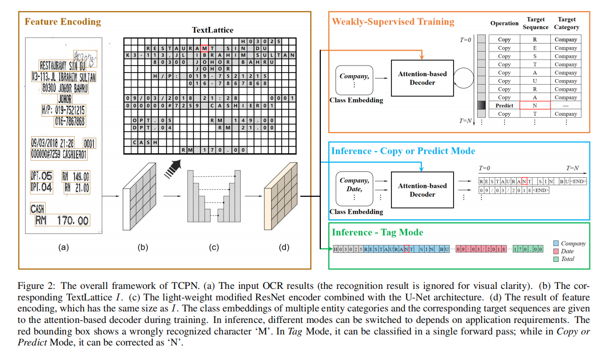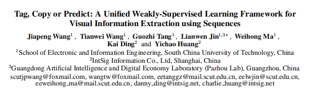 视觉信息提取(VIE)近年来受到了越来越多的关注。现有的方法通常首先将光学字符识别(OCR)结果组织成纯文本,然后利用标记级实体注释作为监督来训练序列标记模型。但是,它花费大量的注释成本,可能导致标签混淆,OCR错误也会显著影响最终性能。在本文中,作者提出了一个统一的弱监督学习框架,称为TCPN(标签、复制或预测网络),它引入了1)一种有效的编码器,可以同时对二维OCR结果中的语义和布局信息进行建模;2)仅利用关键信息序列作为监督的弱监督训练策略;和3)一个灵活和可转换的解码器,其中包含两种推理模式:一种(复制或预测模式)是通过复制输入或预测一个标记来输出不同类别的关键信息序列,另一种(标记模式)是直接标记输入序列。本方法在几个公共基准上显示了最新的性能,充分证明了其有效性。