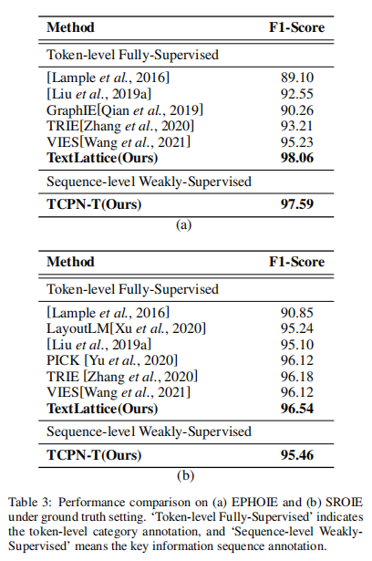 结果如表3所示,论文的方法在字符级全监督的情况下,在SROIE和EPHOIE上都表现出了优越的性能,这完全证明了作者的特征编码方法的有效性。此外,在序列级弱监督设置下的结果取得了竞争性能。这完全证实了作者的学习策略的优越性,它可以模拟输入字符和输出序列之间的对应关系。与SROIE相比,EPHOIE通常内容更少,字符类型更多,这减少了学习对齐的难度。相对而言,由于SROIE中的收据通常包含丰富的字符,而相同的字符可能会重复出现,这可能会导致对齐混淆,因此完全监督和弱监督之间的差距进一步扩大。