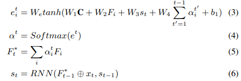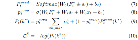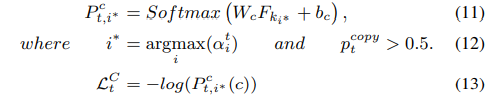 然后,计算固定字典中字符的概率分布,生成一个复制分数作为软开关,在每个时间步t的不同操作之间进行选择:
