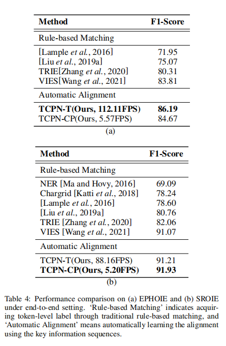 本文也在End-to-End Setting设置下进行了实验,结果如表4。作者的方法在每种模式下都显示了最先进的新性能。可以推断,选择TCPN-CP或TCPN-T模式的一个重要基础是语义和相应语料库的丰富性。在SROIE上,TCPN-CP的性能明显优于TCPN-T,这主要有利于纠错能力;然而,在EPHOIE上,尽管两种模式都优于TCPN-CP的TCPN-CP,主要原因应该是中文字符的多样性和由此导致的语料库的缺乏。