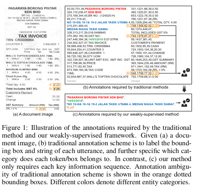 然而,字符级别的类别监督花费了巨大的注释成本,并可能导致标签歧义。给定一个如图1 (a)所示的文档图像,最广泛使用的注释方案是对每个话语的边界框和字符串进行标记,并进一步指出每个字符/框属于哪个类别,如图1 (b).所示这样,需要一个启发式的标签分配过程来训练上述标记模型,其核心思想是将检测到的边框和识别的转录与给定的注释进行匹配,然后为OCR结果的每个字符/边框分配标签。然而,这一过程可能主要会遇到两个方面的问题。首先,错误的识别结果会给匹配操作带来麻烦,特别是对关键信息序列。第二,重复的内容会带来标签的歧义。如图1(a)和(b)所示,三个内容相同的值可以作为关键总量的答案。在大多数情况下,很难建立一个统一的注释规范来确定哪一个应该被视为ground truth。