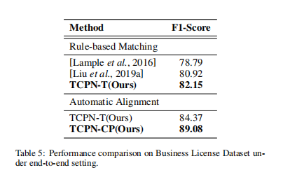 为了进一步探索作者的框架在现实世界的应用程序中的有效性,作者收集了一个内部的营业执照数据集。它包含了2331张由手机或相机拍摄的真实用户需求的照片,而且大部分图像都是倾斜、扭曲或亮度变化剧烈的。作者随机选择1863张图像进行训练,468张图像进行测试,其中有13种实体需要提取。此外,图片是由移动设备产生的,由于图像质量较差,它肯定包含OCR错误。具体结果见表5。作者的端到端弱监督学习框架大大优于传统的基于规则的匹配方法,这也大大降低了标注成本。与TCPN-T相比,TCPN-CP学习到的内隐语义相关性可以通过纠正OCR错误来进一步提高最终性能。一些定性的结果显示在附录中。