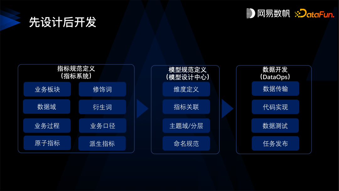 我们提出的解决方案是先设计后开发,其实就是建中台。主要分为指标定义、模型定义、数据开发三个步骤。