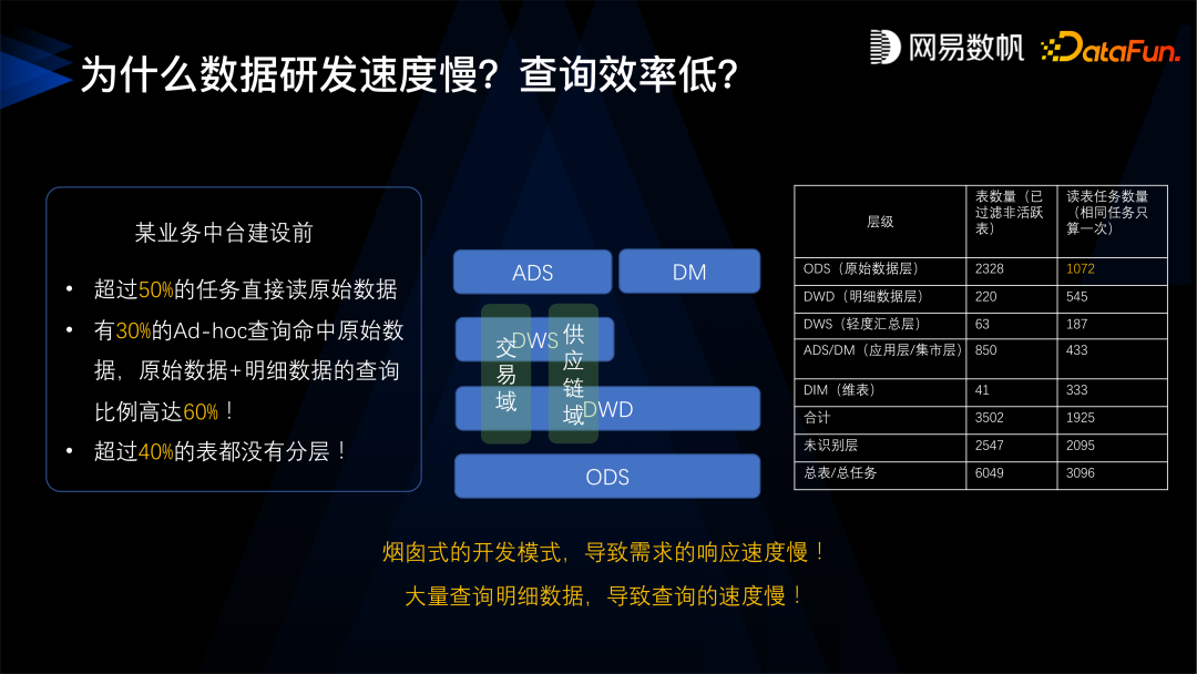 在这种情况下,我们分析了原因,为什么数据研发的速度会慢?查询的效率会低?我们做了一些数据的分析,结果发现有超过 50% 的任务,是在直接读取原始数据, 也就是 ODS 层的数据,并且有 30% 的 Ad-hoc 查询命中原始数据,原始数据加明细数据的查询比例高达 60%,另外超过 40% 的表都没有分层,这些其实都是烟囱式建设带来的问题。各个业务线都是从 ODS 层开始拉数据来建设,没有形成很好的数据公共层,数据复用程度不足。结果导致需求响应非常慢,查询效率特别低下,规范也特别不好,整体就是数据不好用。