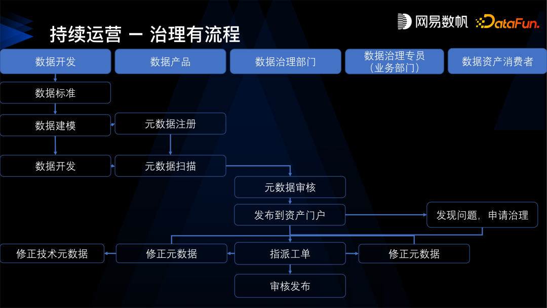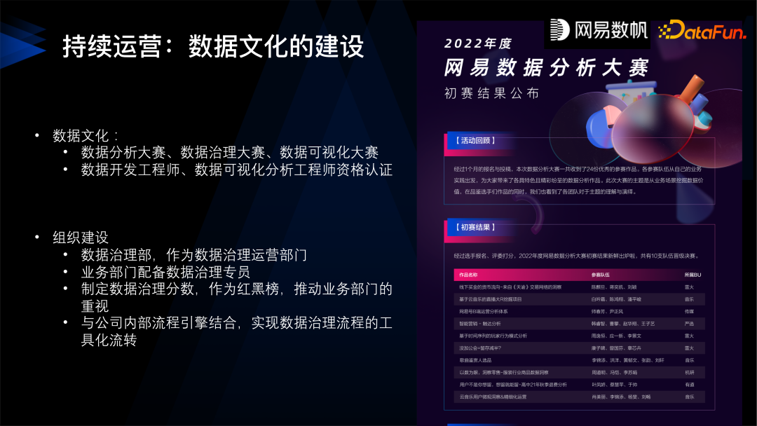 持续运营还包括文化的建设,我们在网易内部每年都要组织数据分析大赛、数据治理大赛。数据治理大赛看起来比较抽象,但每年都有超过 20 个团队来参加,我们选择其中比较优秀的评奖,并在公司发全员邮件进行表彰,也会做可视化的大赛等等。我们也提供了一些培训,数据开发工程师、数据分析工程师的资格认证培训。我们有些业务部门要求我们给他的员工先出个证,要是没有这个证是不允许去线上操作的。在组织方面也可以建设数据治理部门,也可以在业务部门配置数据治理专员,这样才能更好地把数据治理落地。