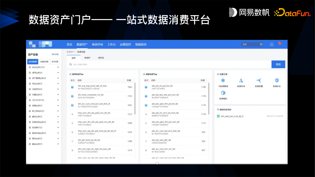 在数据资产消费方面我们提供了一站式的数据消费平台。通过这样的消费平台,业务人员可以在数据资产门户上看到企业到底有哪些数据、哪些报表、哪些资产,很方便地去申请权限,无缝的在上面跳转到 BI、自助取数,或是其它各种消费数据的地方。管理员也可以根据资产的访问情况进行运营。管理数据就像管理商品一样,如果是不好的数据就应该给予下线,好的则应该给予更好的展示位。