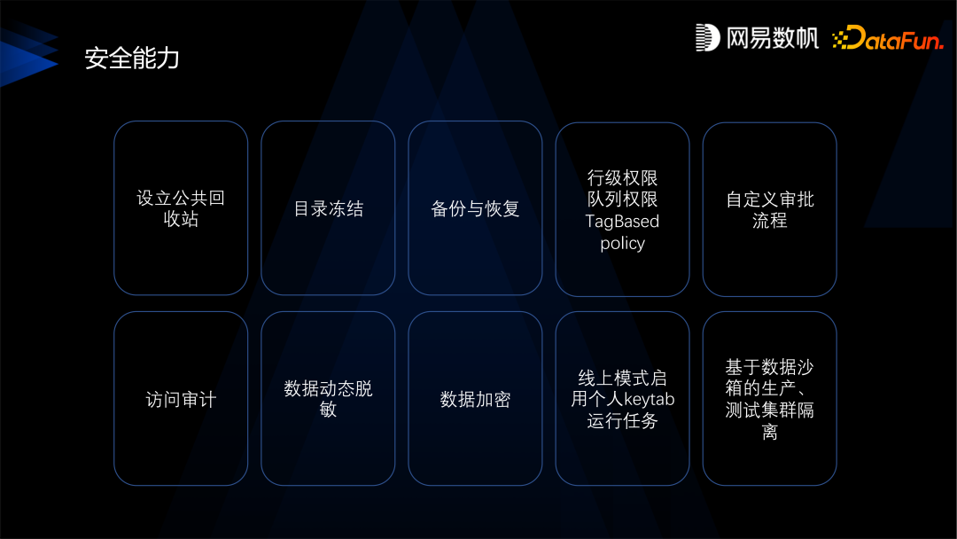 针对以上问题我们也做了各种的应对能力,比如设置了公共的回收站,改造 HDFS 回收站,使得删掉数据一定能进回收站;实现了目录冻结,比如数仓的根目录不能删除;备份恢复,数据备份到其他集群,即使整个集群出问题,也不会造成数据丢失;实现了行级的权限、队列的权限,实现了标签的权限控制,也实现了自定义的审批流程, 比如每个部门每种级别的数据可以制定自定义的审批流程。
