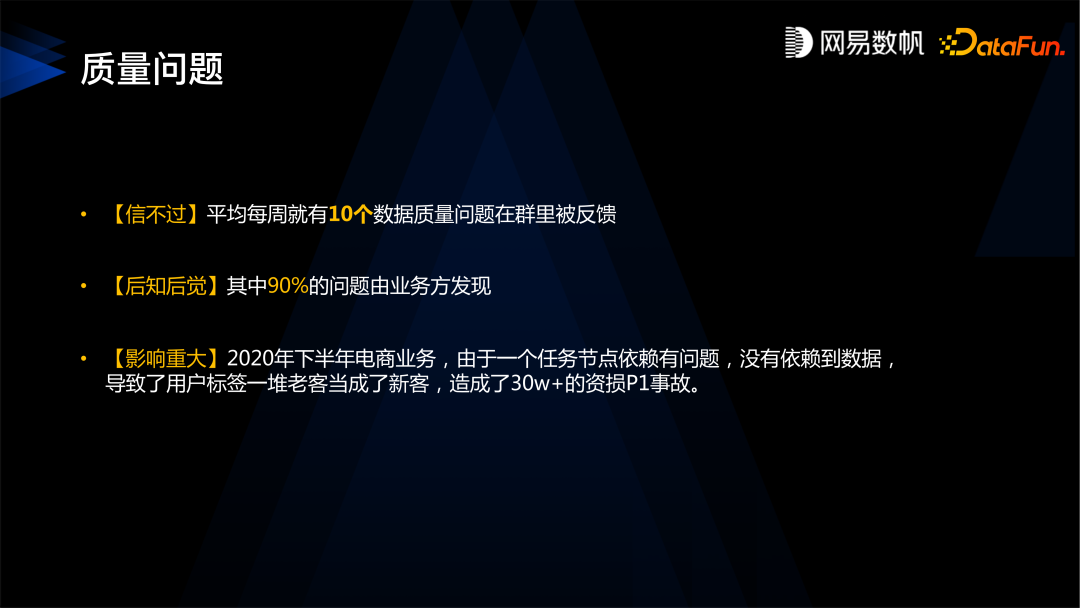 第二个严重的问题是质量问题,平均每周会有 10 个数据质量问题在群里被反馈,更糟糕的是其中 90% 的问题是由业务方发现的。还有一些非常严重的缺陷甚至会导致资损,比如曾有一次事故就是因为某个任务节点配置的问题,导致把老客户当成了新客户,造成了 30W 的营销资源损失,造成了 P1 的事故。