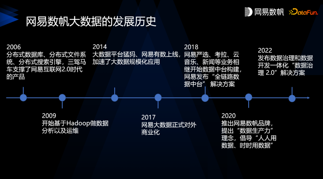 网易大数据团队最早致力于分布式数据库、分布式文件系统和分布式搜索引擎。2009年开始基于 Hadoop 做数据分析和运维。2014 年大数据平台上线,并开始BI的产品化。2017 年正式对外做商业化的探索。在2018 年的时候,随着业务的发展,网易使用数据面临了很多的问题,所以开始建设数据中台, 发布了数据中台的解决方案。2020 年通过网易数帆品牌正式提出了数据生产力的概念,提出不仅仅要建设数据中台,还要建设数据中台上的数据产品,提倡“人人用数据”的理念。2022 年数据治理 2.0 产品正式发布。