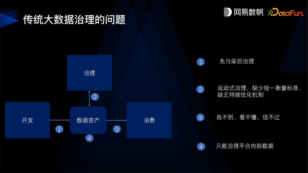 传统的大数据治理分为三个过程,首先是开发,产生数据资产;然后消费数据资产,产生价值;治理在中间,想方设法让我们的数据资产质量更好、更安全,更容易被使用。这是数据治理的目标,但是这样的模式存在一些问题: