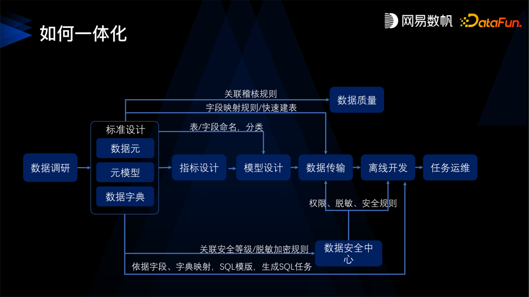 如何真正的使得开发治理一体化落地呢?我们建设了数据标准产品,并与其他子产品做联动、关联,才能确保数据治理能落在数据研发的全生命周期里面,能够紧密结合起来。比如数据标准要和数据质量结合,数据质量就会自动的去开启关于某个字段或者关于某个表的稽核规则;标准要与数据传输去做很好的联动,从数据源到目的地会做自动的表的映射、字段的映射、表数据字典、枚举值的映射。然后数据标准也需要跟模型设计去做关联,这样字段和表的命名就能标准,并且数据目录分类也会标准。标准还要跟数据安全中心去关联,安全中心就会自动得到安全等级是什么,其加密和脱敏的规则是什么,安全审批的流程是什么样,更高等级的数据通常需要更高、更复杂的审批流程。数据标准还可以跟离线开发结合,利用一些 SQL 模板自动做一些 ETL 任务的生成。通过这样一个紧密的关联才能实现研发和治理的一体化。