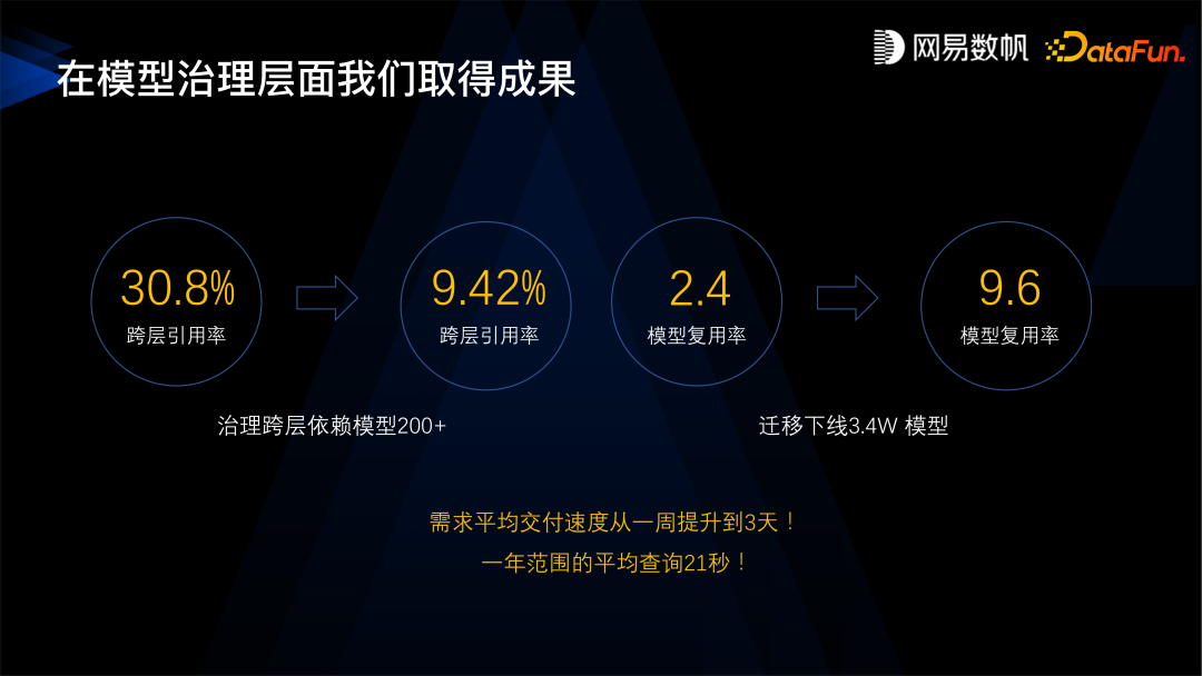通过模型的重构,数据中台的建设,取得了显著成果,跨层引用率从 30% 下降到了10% 以下,模型的复用度从 2.4% 提升到了 9.6%,在这个过程中下线了 3.4 万个模型。通过这样的中台建设,我们的模型更加优化,使得我们的交付速度和查询的性能也得到了显著提升。这就是第一阶段,建设了数据中台,先设计后开发,把模型的问题解决了。但是并没有解决所有的问题,后面又出现了各种各样其他的问题,下一阶段我们主要是针对出现的问题见招拆招。