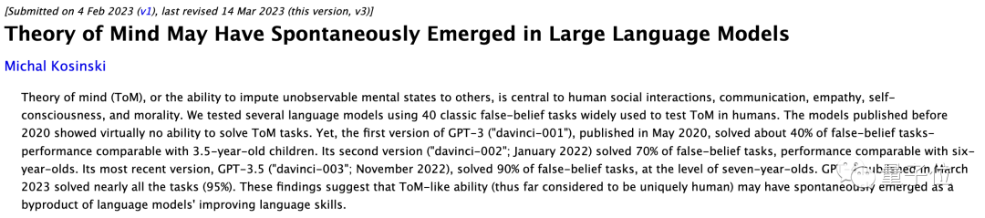 就在前几天他曾发表一篇相关论文:心智理论可能自发地出现在大型语言模型中。