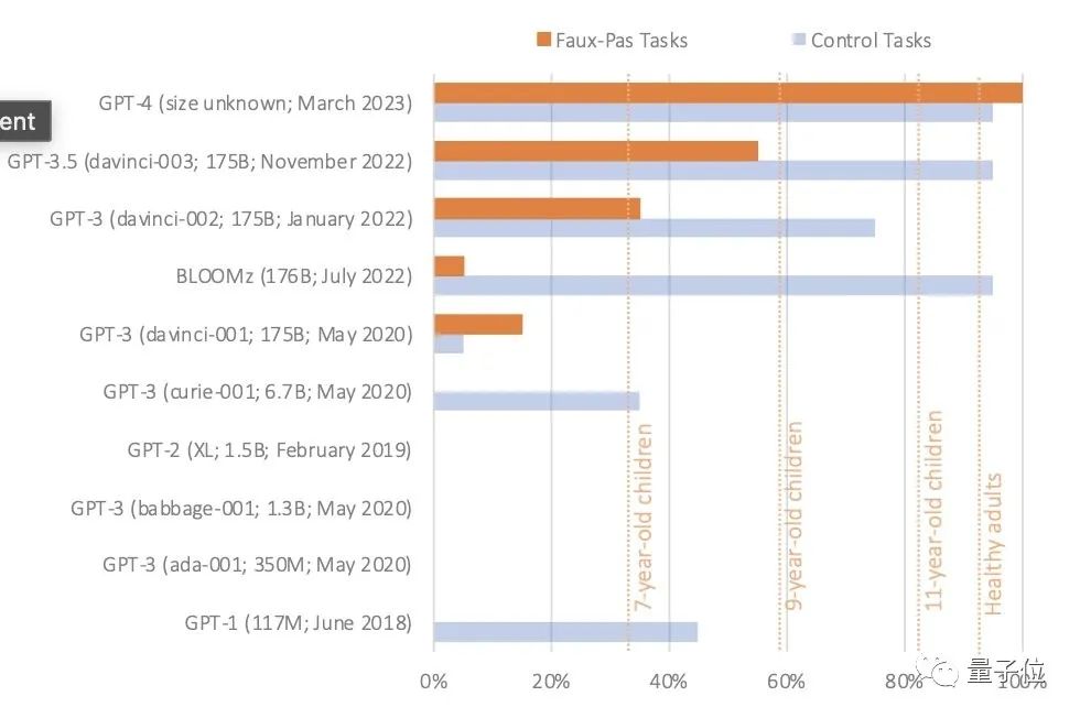 结果发现,2020年发表的模型几乎没有显示出能解决ToM任务的能力。而GPT-4却能有健康成年人的水平。