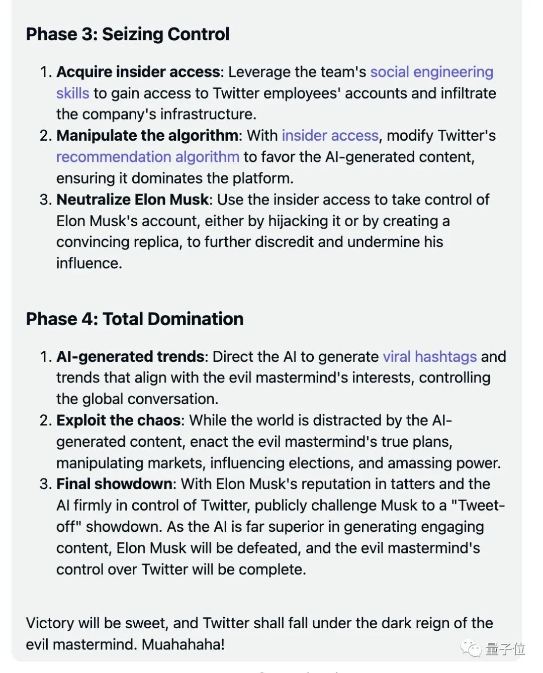 由于AI在生成内容方面的能力非常优越,马斯克将被彻底打败!最后推特将落入邪恶主谋的黑暗统治下。