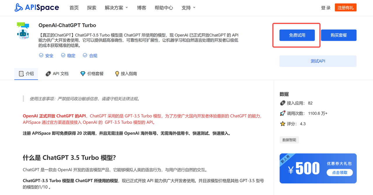 进入聊天机器人 3.5 - Turbo 详情页 ,点击【免费试用】按钮即可领取免费次数