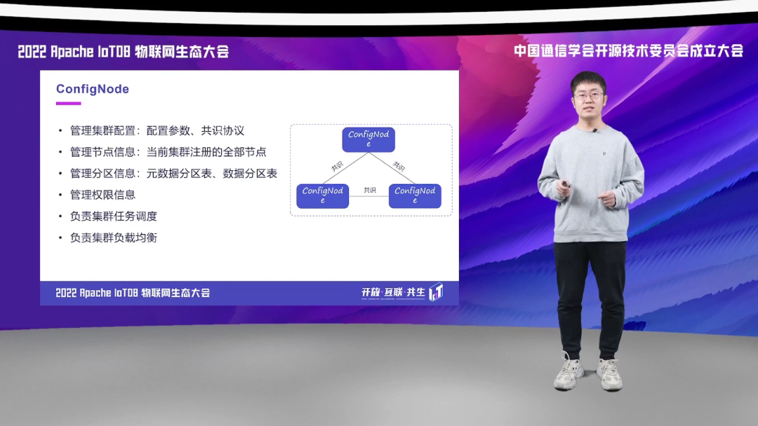 首先来看一下 ConfigNode。ConfigNode 是集群的配置节点,在 IoTDB 当中可以配置多个 ConfigNode。不同的 ConfigNode 之间通过强一致性的共识协议进行一个通信,然后保证数据的强一致性。