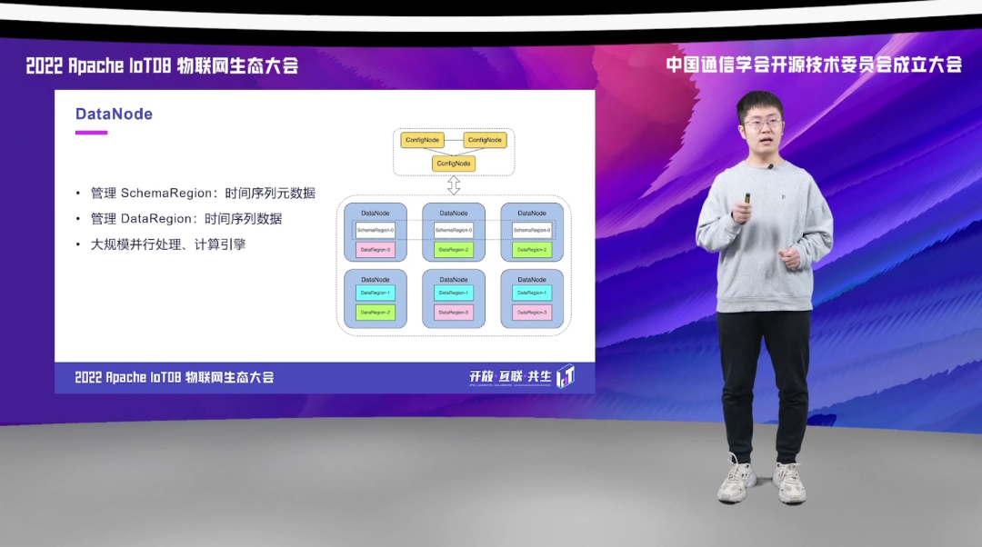 可以看一下,这一页 PPT 就是 IoTDB 对于物联网时序系统的一个存算分离的设计。刚刚我们也讲过,在默认情况下,IoTDB 的 DataNode 是同时承担计算与存储两种角色的,但是实际上我们也可以将 DataNode 配置成只进行查询与计算的节点。