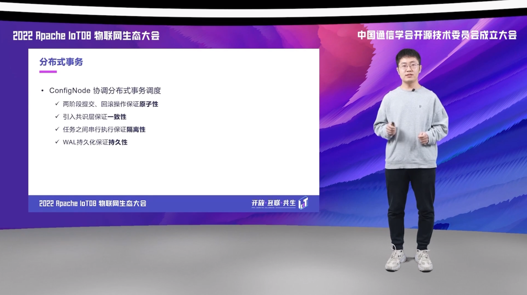 对于刚刚讲到的任务调度、分区创建等一些操作,ConfigNode 还会使用分布式事务进行一个实现。我们通过引入两阶段提交、支持回滚操作等,实现了事务的原子性。通过引入共识层,实现了一致性。通过事务框架,实现了任务之间的串行隔离,保证了事务的隔离性。通过引入共识层,以及 WAL 的持久化,我们保证了事务的一个持久性。