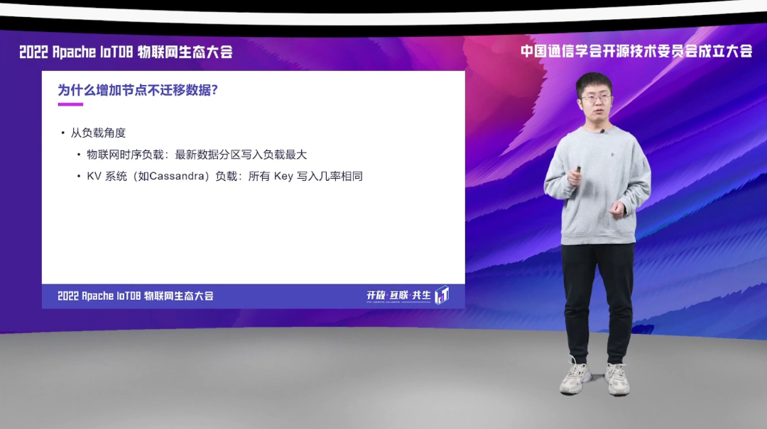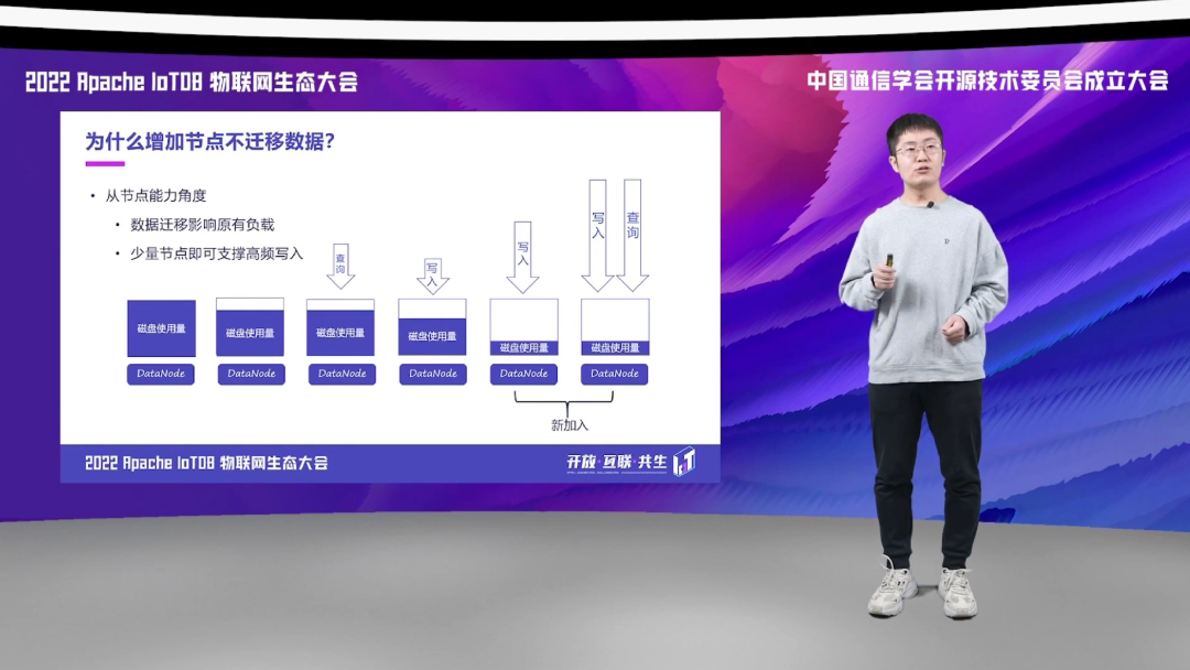 增加节点不进行迁移数据的第二个原因,是从节点能力进行考虑的。假如说,我们增加节点,并且迁移原有的数据的话,很大程度上会影响原有的负载,迁移数据的耗时也直接影响系统的可用性。并且,在 IoTDB 的集群设计当中,少量的节点其实就可以支撑我们比较高频的写入。所以从节点能力的角度来考虑,扩容后大量迁移数据是一个没有充分利用物联网时序特性的一个设计。